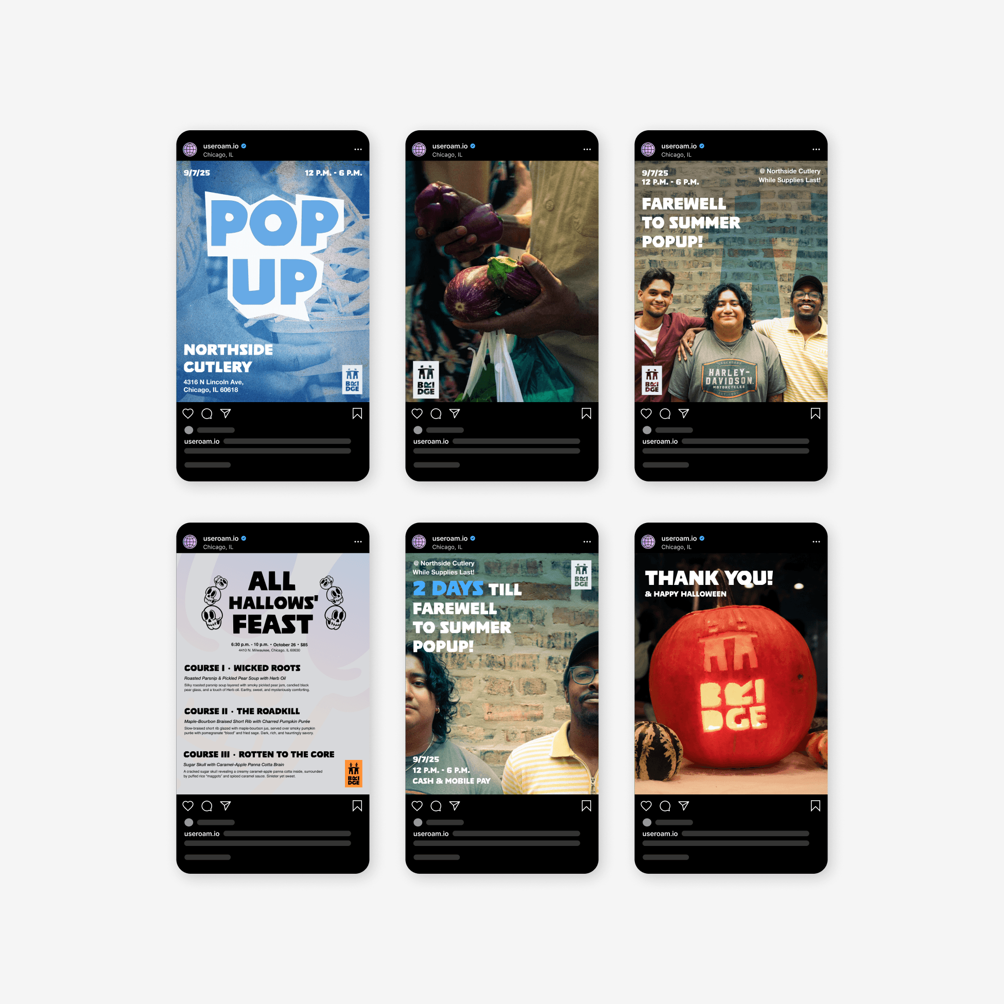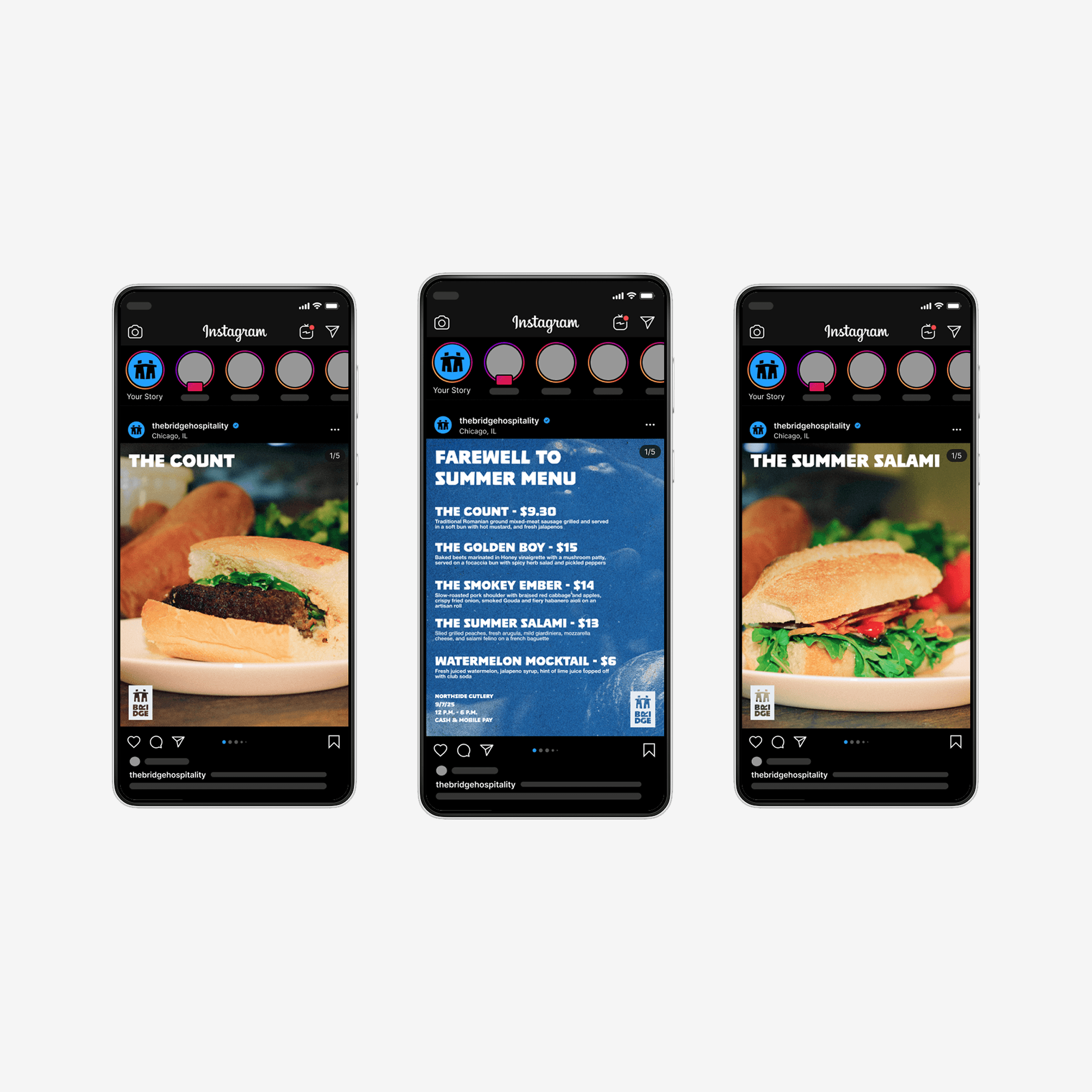 Bridge needed social media posts, posters, and menus to build hype around the upcoming events. We organized photoshoots to capture the founders and their events in action to enhance brand authenticity by providing followers a glimpse behind the scenes.