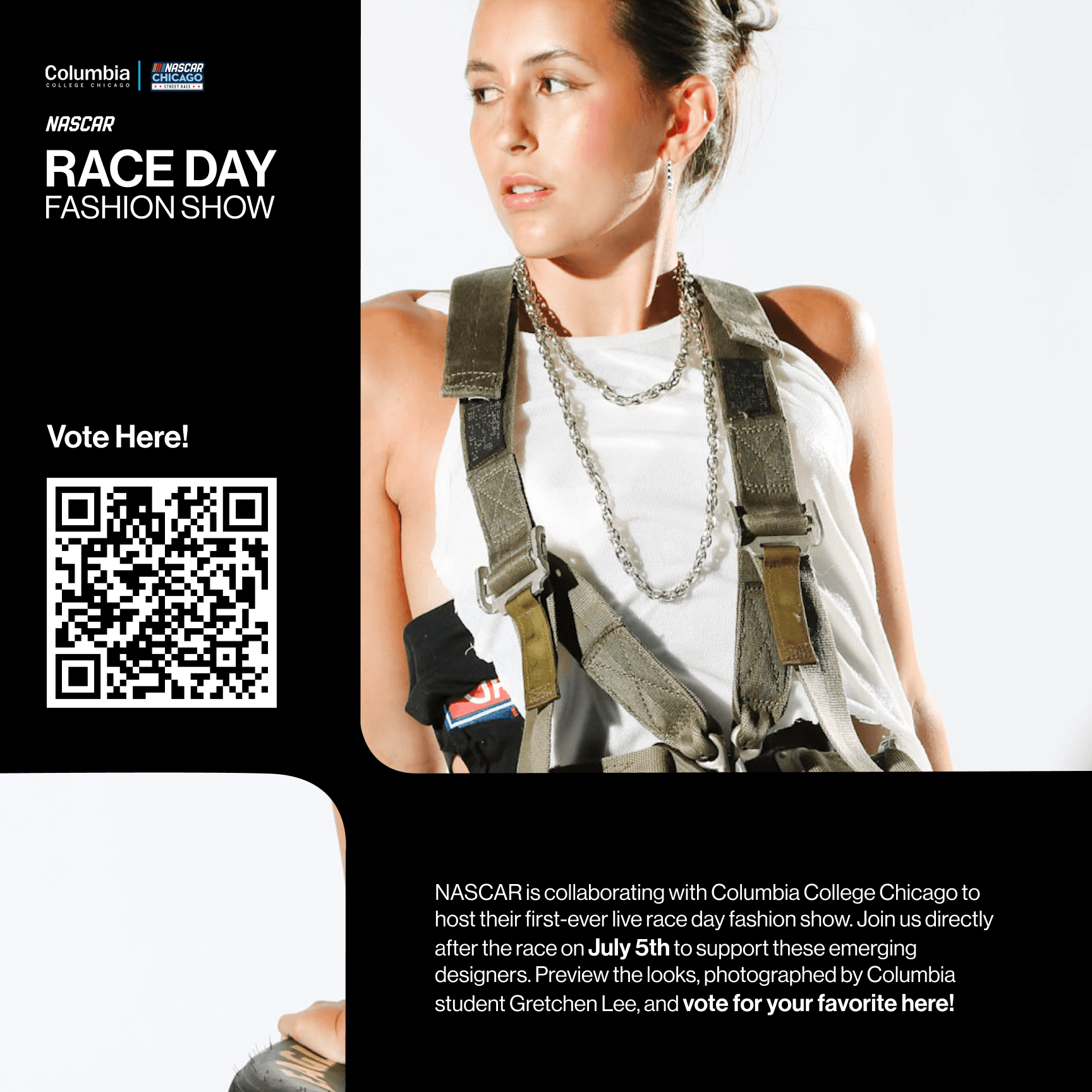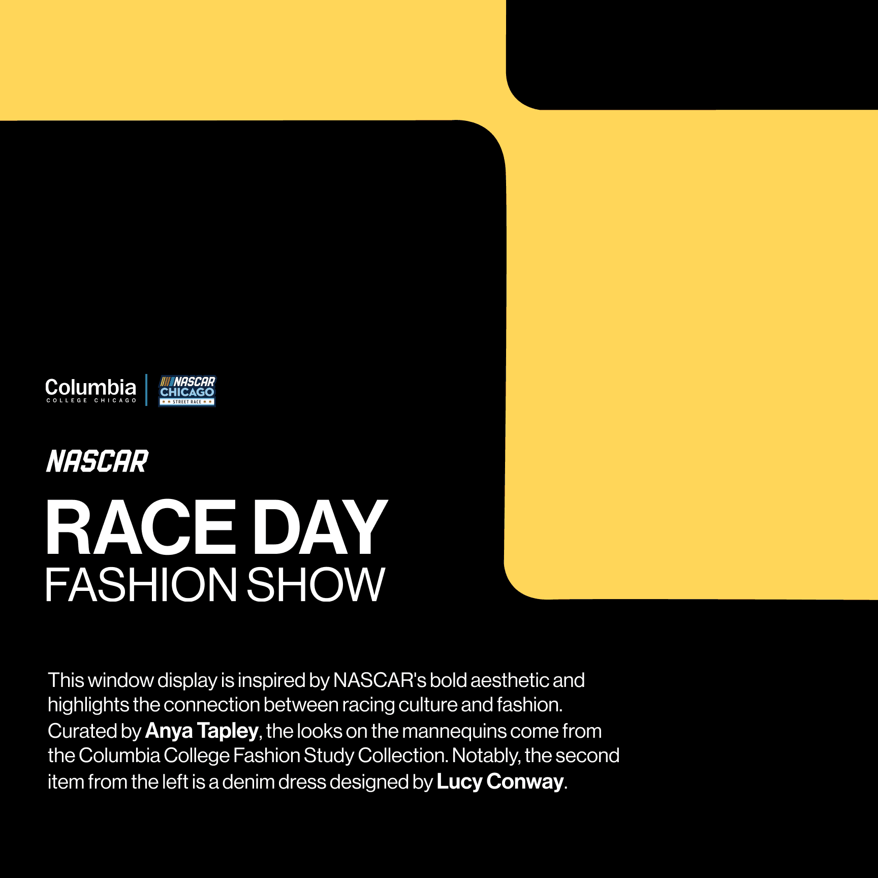 The activation highlights capsule collections crafted by seniors, juniors, and designers at Columbia College Chicago. This merged fresh innovative designs with the spirit of NASCAR. Alongside the pop-up fashion show, we proposed a window display at 618 S Michigan Ave, which is on the first turn of the race track and is the home to the School of Fashion. After meeting with the president of the NASCAR Chicago Street Race, we got approval to bring our proposal to life at the street race in July of 2025.